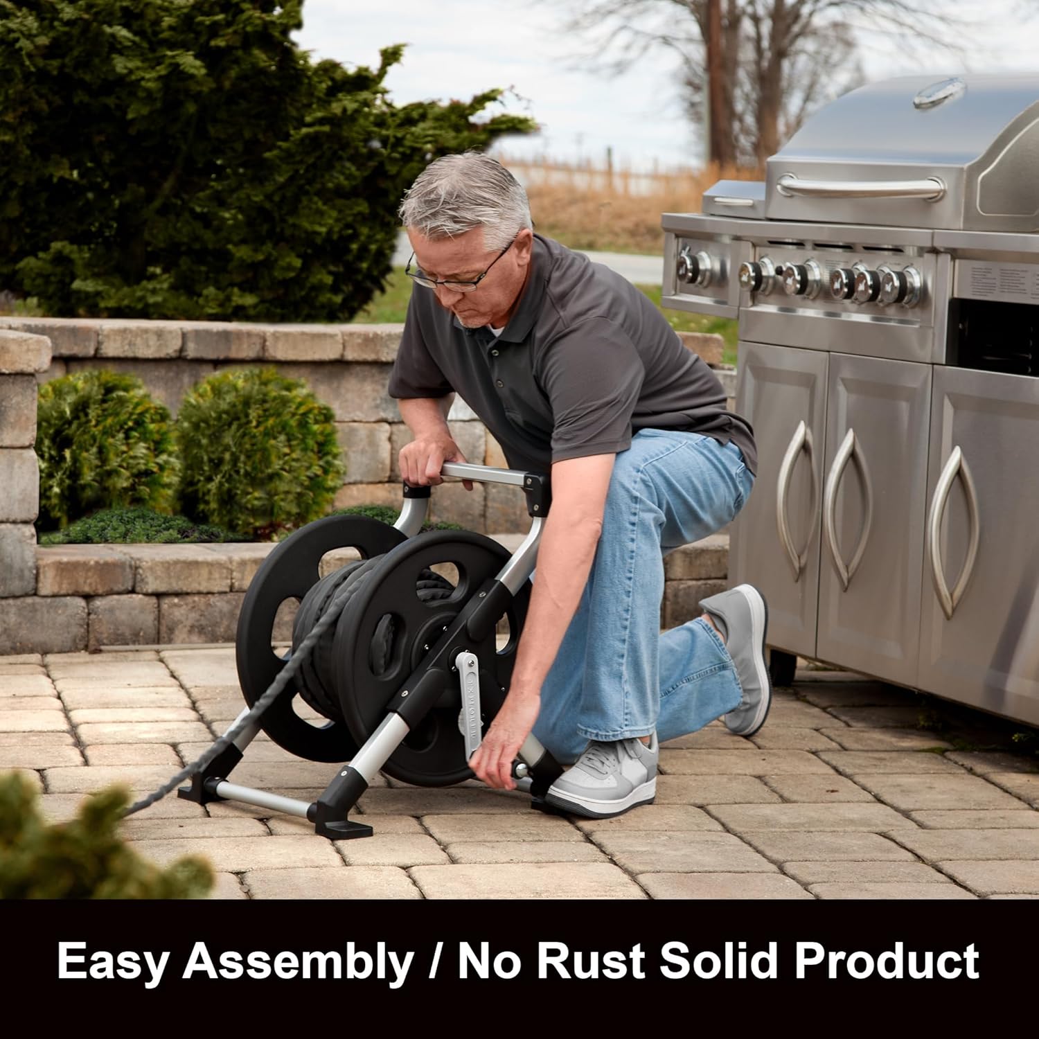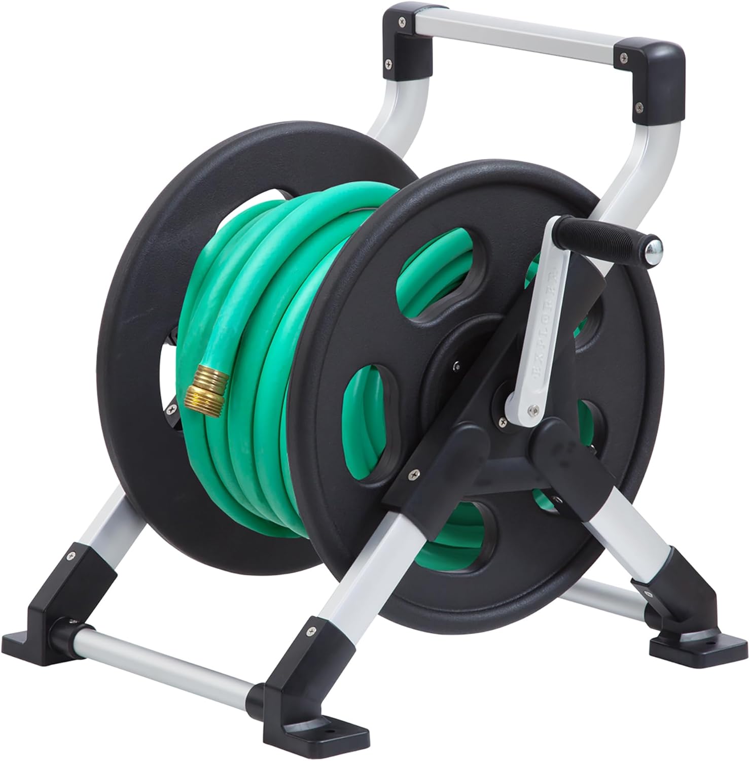 The sleek silver and black design adds a touch of modern elegance to your outdoor space, while the ergonomic handle and crank make winding and unwinding your hose a breeze. With its sturdy construction and innovative design, the Liberty Garden 306 Explorer Hose Reel is the perfect blend of style and functionality.